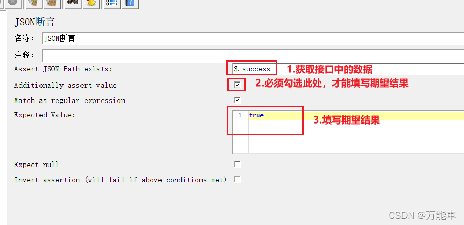 目录 一.对接口中的一个返回值进行断言 二.若希望接口返回的结果不等于某数值时 三.当接口返回数据中包含多个相同名称的参数时 总结 如果接口返回的数据是json格式的,如果需要对结果断言,可进行如下配置 一.对接口中的一个返回值进行断言 1.以登录接口为例子,接口返回的内容如下所示 2.如果要在Jmeter接口中对success返回值进行判断,判断值为true的时候为测试通过,那么就加一个json断言 3.json断言按如下图进行配置: 二.若希望接口返回的结果不等于某数值时 如果你的测试是希望