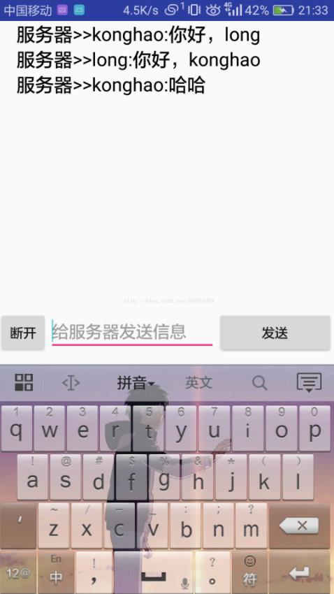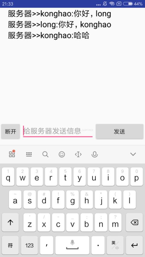 进入活动时候创建一条线程,完成socket连接,和循环监听接受服务器发来的消息。当发送按钮按下后,向服务器发送消息。退出活动时候,向服务器发送结束通信信息,服务器收到后关闭socket。