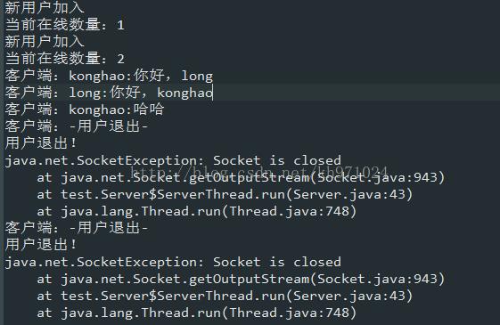 /** * Created by konghao on 2017/11/8. */ public class Server { static List<Socket> cons = new LinkedList<Socket>(); private static Socket socket = null; public static class ServerThread extends Thread{ private Socket s; public ServerThread(Socket socket){ this.s = socket; cons.add(s); } @Override public void run(){ System.out.print("新用户加入\n"); System.out.print("当前在线数量:"+cons.size()+"\n"); try{ while(true){ BufferedReader br = new BufferedReader(new InputStreamReader(s.getInputStream())); String mess;// = br.readLine(); //保存信息 if((mess=br.readLine())!=null) { if(mess.equals("-用户退出-")){ s.close(); } System.out.print("客户端:" + mess + "\n"); BufferedWriter bw = new BufferedWriter(new OutputStreamWriter(s.getOutputStream())); //为了证明是服务器返回的数据,我对mess修改在发送到客户端 //这里修改广播到所有客户端 for (Socket so : cons){ BufferedWriter buffw = new BufferedWriter(new OutputStreamWriter(so.getOutputStream())); String str = "服务器>>"+mess+"\n"; buffw.write(str); buffw.flush(); } // //单客户端通信 /* String str = "服务器>>"+mess+"\n"; bw.write(str); bw.flush(); */ } } }catch (IOException e){ System.out.print("用户退出!\n"); cons.remove(s); e.printStackTrace(); this.interrupt(); //e.printStackTrace(); }catch (NullPointerException e) { System.out.print("NullPointerException"); }finally { try { s.close(); }catch (IOException e){ System.out.print("IOException-2"); e.printStackTrace(); } } } } public static void main(String[] args) throws IOException { ServerSocket ss = new ServerSocket(30001); while(true){ Socket s = ss.accept(); new Thread(new ServerThread(s)).start(); } } }
