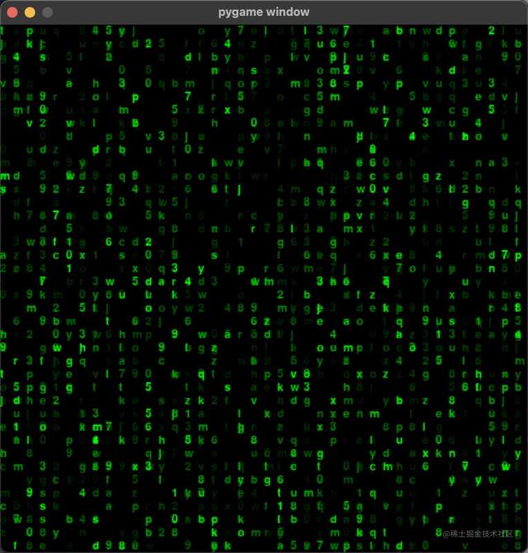 # 内容 lib=[chr(i) for i in range(48,48+10)] + [chr(i) for i in range(97,97+26)] # [0-9 a-z] texts = [font.render(l, True, (0, 255, 0)) for l in lib] cols = list(range(40)) # 字体15, 窗口600