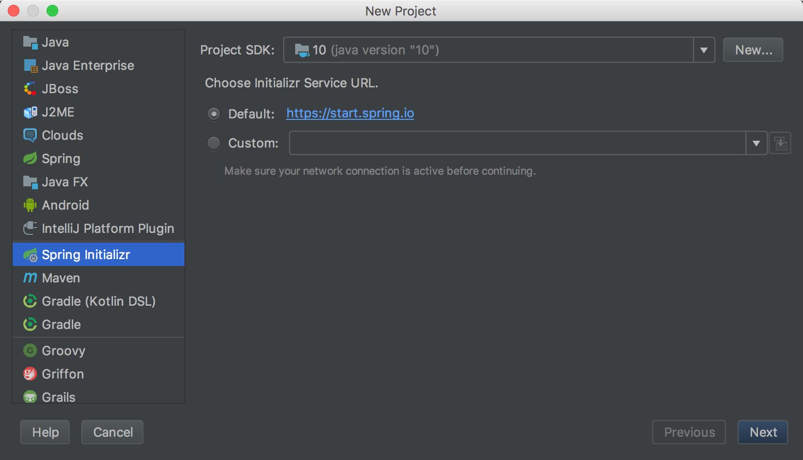 首先,创建项目(选择“Spring Initializr”,Spring Boot 项目),默认选择 Java SDK 10: