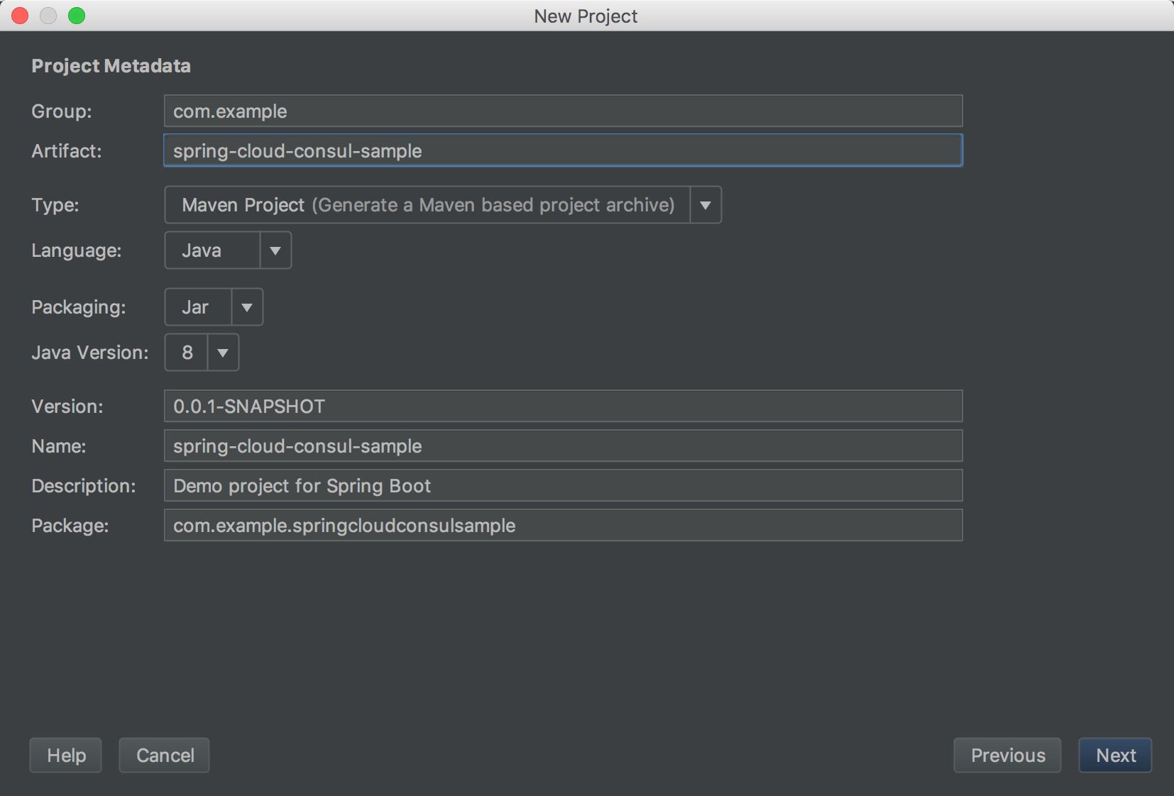 然后填写项目的基本信息(Artifact 为"spring-cloud-consul-sample",其他为默认):