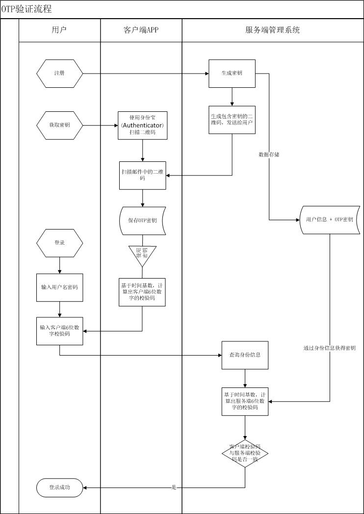由于客户端需要存储密钥和计算校验码的载体,阿里云的身份宝(或者Google 的Authenticator)提供了手机端的APP进行密钥存储和校验码计算。下面我们以这两款客户端为例,实现在应用采用OTP进行权限验证,主要流程如下图: