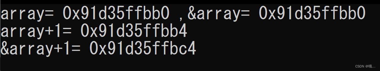 - &array+1输出的结果中地址值相较于&array增加了20个字节(0x14 bytes)。