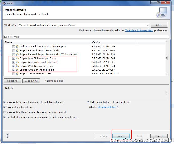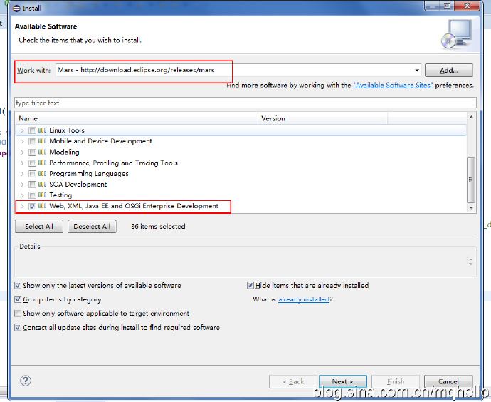 eclipse会搜寻这个网址的所有软件,并且显示到下面的列表(建议使用代理,否则可能要花很长时间显示和下载插件,至于如何设置eclipse代理,请自行百度)。