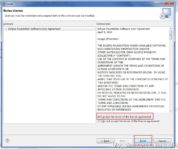 依次点击“Next ”直到你看到 “ Review licences”的窗口,在这个窗口选择 "I accept the terms of the licence agreement" 并且点击“Finish”。