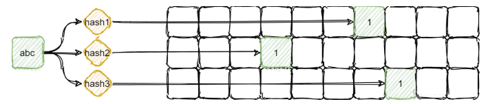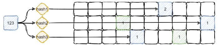 比如上图元素123映射到了元素abc第一行的相同位置,因此这个位置的计数累加了元素abc和元素123的计数和。但是只要我们取三行里面最小的一个计数,那么就能容忍这种情况。