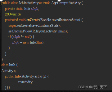 如何解决呢?Info作为Activity的静态成员,并且持有Activity的引用,但是sInfo作为静态变量,生命周期肯定比Activity长。
