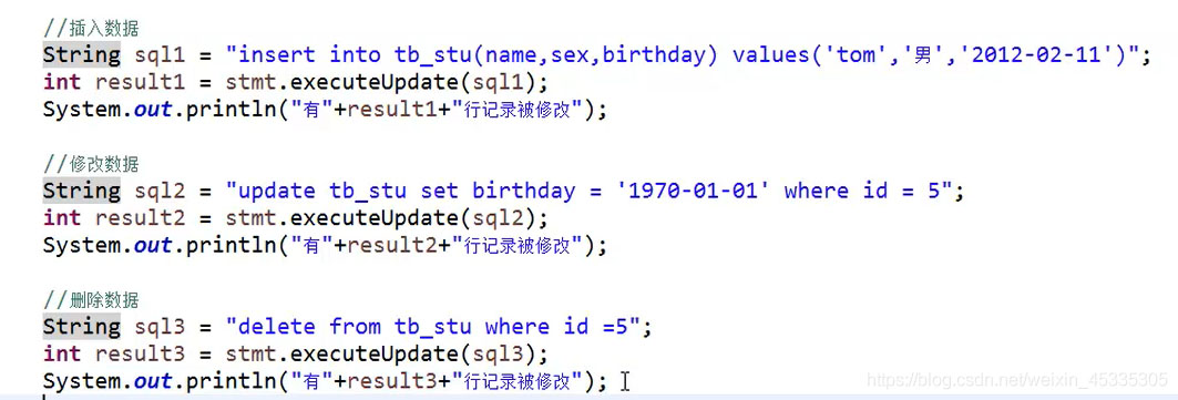 目录 Update Insert Delete 需要注意的点 1.字符串的拼接必须在双引号的基础上被单引号套住 2.在Bean类,默认的构造方法还与参数顺序有关 3.构造方法的方法名就是类名.... 4.system.out.println 里打印加不加toString的区别 5.sql语句里,双引号的里面套双引号,会有歧义 executeUpdate Update //没有返回值 public void update(int count){ conn=DBUtil.getConn(); Str