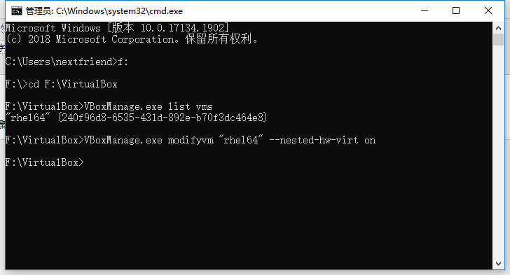 "rhel64" {240f96d8-6535-431d-892e-b70f3dc464e8}F:\VirtualBox>VBoxManage.exe modifyvm "rhel64" --nested-hw-virt on