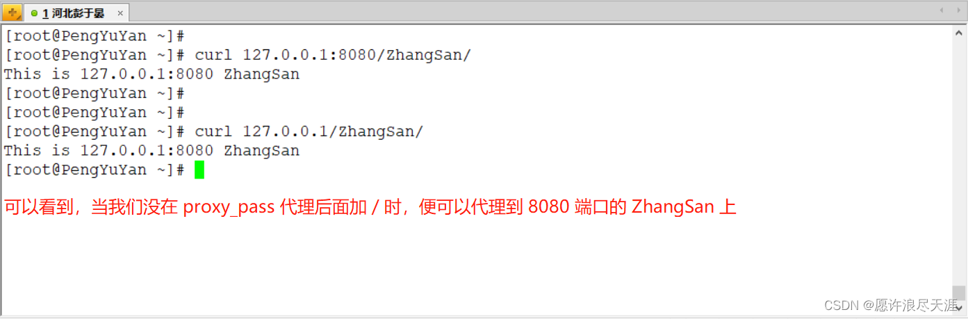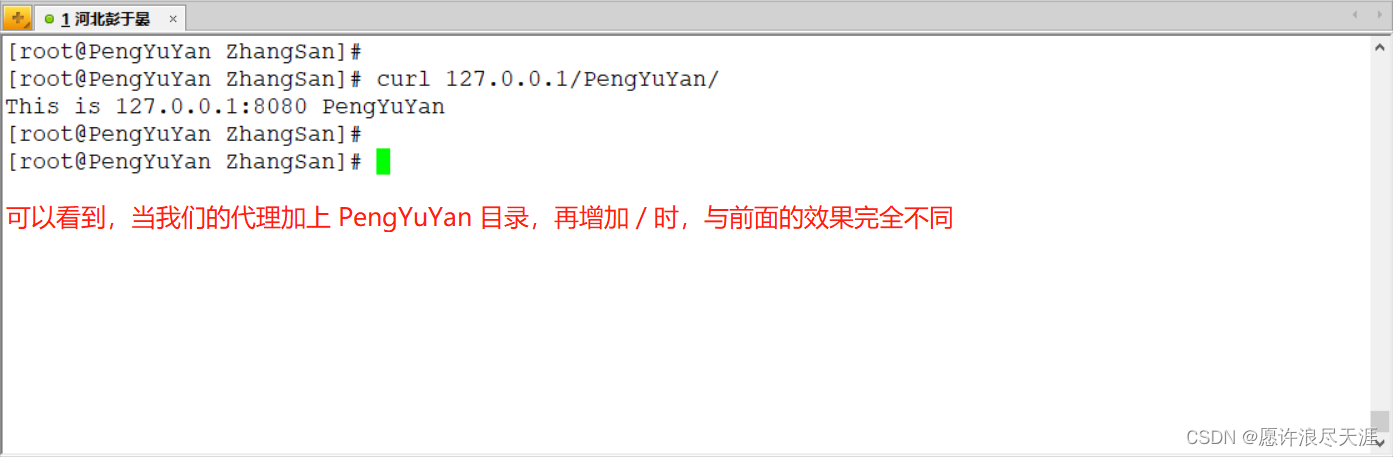 也就是说,我们要是如上配置,想要访问到 8080 端口的 PengYuYan,则需要 curl 127.0.0.1/PengYuYan/PengYuYan/。