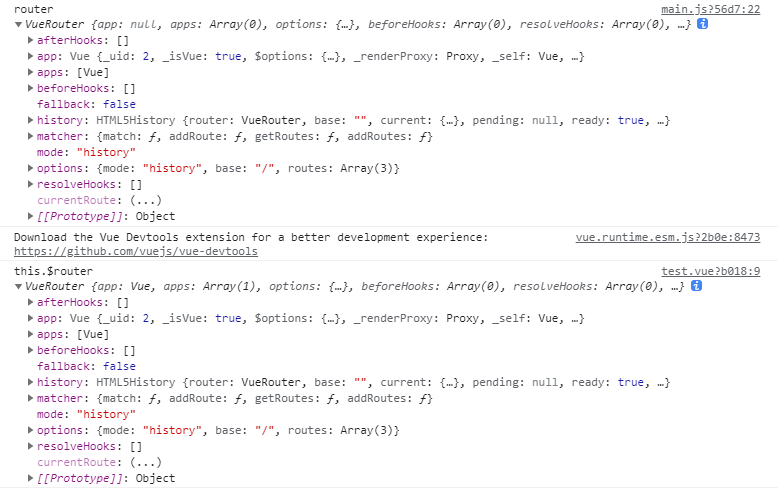 试着在main.js 打印 router 在任意组件内打印 this.$router,打印结果如图: