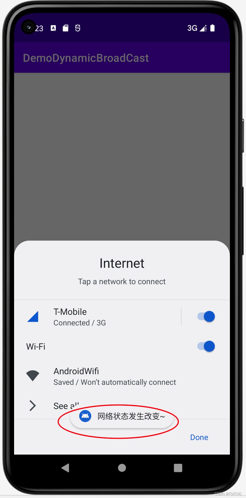 - 你可以看到下方有浮动的Toast显示“网络状态发生改变”