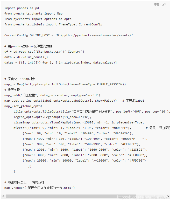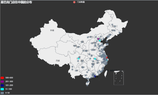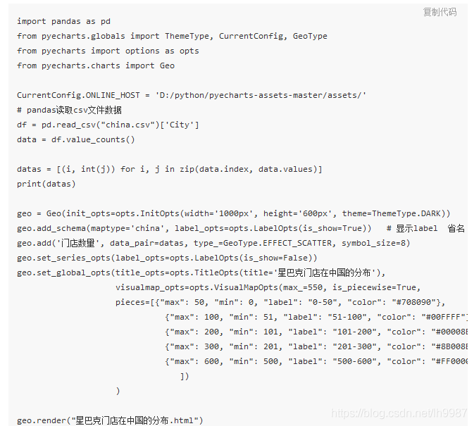 利用china.csv 中的数据,首先计算每个城市(City)对应的门店数量,然后使用 pyecharts包内 Geo 模块绘制星巴克门面店在中国分布的涟漪散点地图。