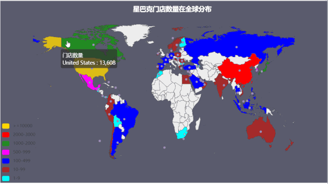 利用 Starbucks.csv 中的数据,首先计算每个国家(Country)对应的门店数量,然后使用世界地图表示星巴克门面店在全球的分布。