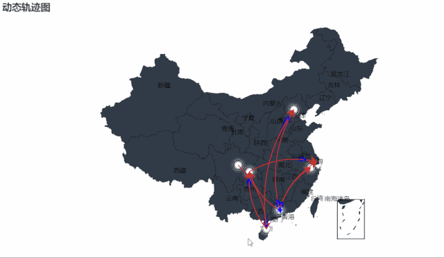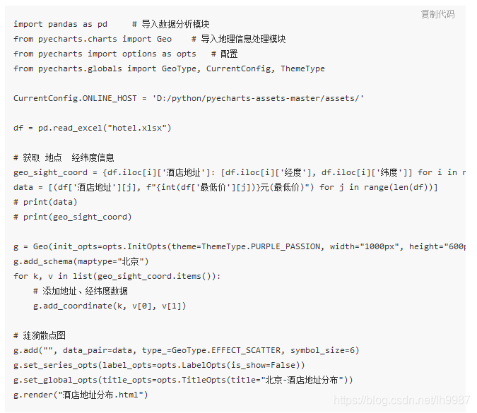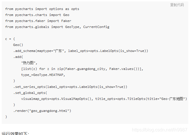一.例子:百度迁徙 百度地图春节人口迁徙大数据(简称百度迁徙),是百度在2014年春运期间推出的一项技术项目.百度迁徙利用大数据,对其拥有的LBS(基于地理位置的服务)大数据进行计算分析,采用的可视化呈现方式,动态.即时.直观地展现中国春节前后人口大迁徙的轨迹与特征. 网址:https://qianxi.baidu.com/2021/ 二.基础语法介绍 语法 说明 from pyecharts.charts import Geo 导入地图库 Geo() Pyecharts地理图表绘制 .add_