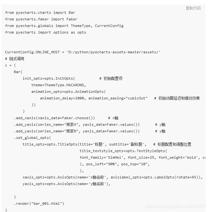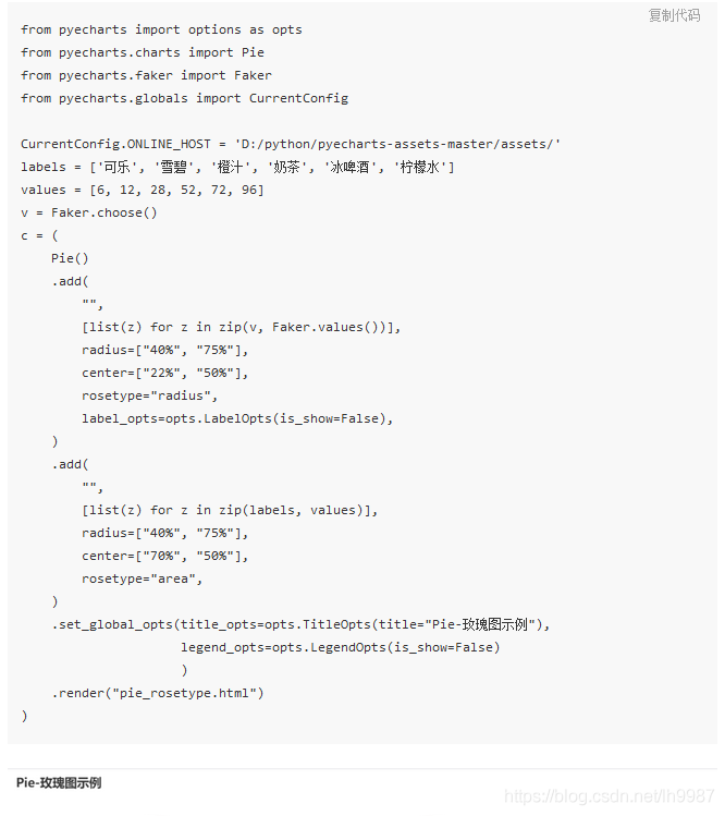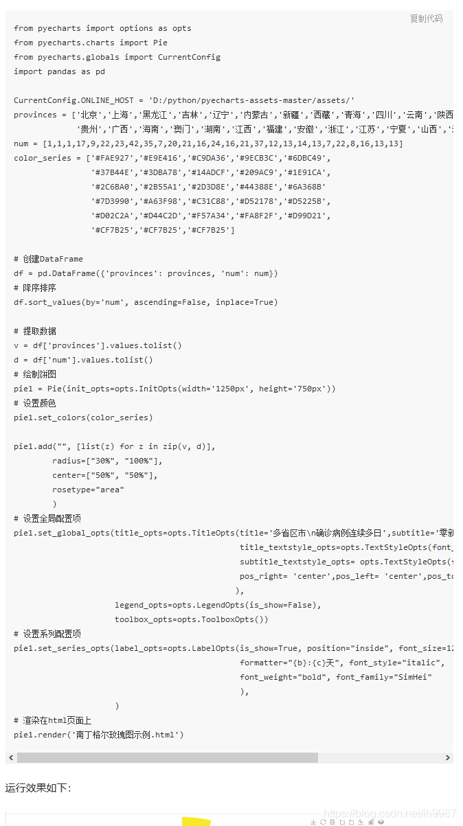 在Flask页面展示echarts,主要有两种方法: 方法1.原生echarts方法 自己在前端引入echarts.js文件.自己创建div.自己初始化echarts对象.自己从官网复制并且配置图表.自己给echarts对象设置配置项实现绘制,这种方法的缺点是配置项都是js的形式比较繁琐,对于后端开发人员来说有点过于参与前端js部分的配置开发: 这种方式参照echarts官网的方式,其实跟flask没有多大关系,php/java不同后端语言都一样,地址 方法2:使用pyecharts pyech