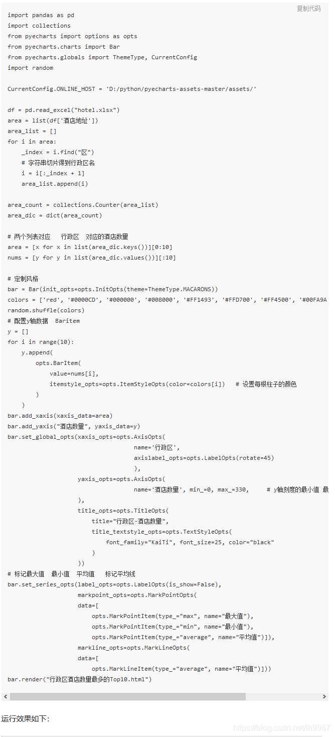 目录 1.直方图 2.折线图 3.箱形图 4.散点图 5.带涟漪效果散点图 6.k线图 7.热力图 8.象型图 9.层叠图 总结 1.直方图 # -*-coding:utf-8 -*- # @Time : 21:02 # @Author: 黄荣津 # @File : 1.直方图.py # @Software: PyCharm from pyecharts.charts import * from pyecharts.components import Table from pyecharts i