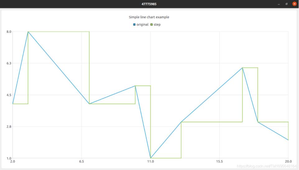 #include <QApplication> #include <QChartView> #include <QLineSeries> #include <QDebug> QVector<QPointF> convertLine2Step(const QVector<QPointF> &points) { QVector<QPointF> s; s << points.at(0); int x, y; for (int i = 1; i < points.count(); i++) { x = points.at(i).x(); y = points.at(i - 1).y(); s << QPointF(x, y); s << points.at(i); } return s; } int main(int argc, char *argv[]) { QApplication a(argc, argv); QtCharts::QChartView w; w.setRenderHint(QPainter::Antialiasing); QtCharts::QChart chart; chart.legend()->setVisible(true); w.setChart(&chart); QtCharts::QLineSeries *series = new QtCharts::QLineSeries; QVector<QPointF> points; points << QPointF(2, 4); points << QPointF(3, 8); points << QPointF(7, 4); points << QPointF(10, 5); points << QPointF(11, 1) << QPointF(13, 3) << QPointF(17, 6) << QPointF(18, 3) << QPointF(20, 2); *series << points.toList(); series->setName("original"); QtCharts::QLineSeries *stepSerie = new QtCharts::QLineSeries; *stepSerie << convertLine2Step(points).toList(); stepSerie->setName("step"); chart.addSeries(series); chart.addSeries(stepSerie); chart.createDefaultAxes(); chart.setTitle("Simple line chart example"); w.show(); return a.exec(); }
