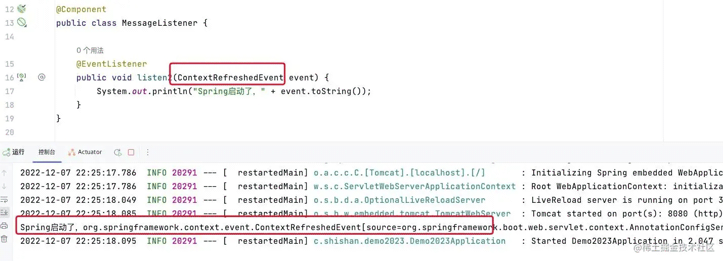其实Spring项目启动后发布的真正Event是ContextRefreshedEvent,我们修改下代码再看一下结果: