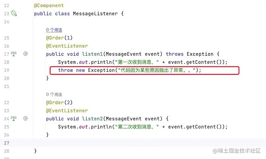 如上图所示,我们定义了两个Listener,原本期望按照order定义的顺序,将消息传播依次传播。然而因为一些原因,Listener1中的方法抛出了异常,导致Listener2无法接收到消息了。