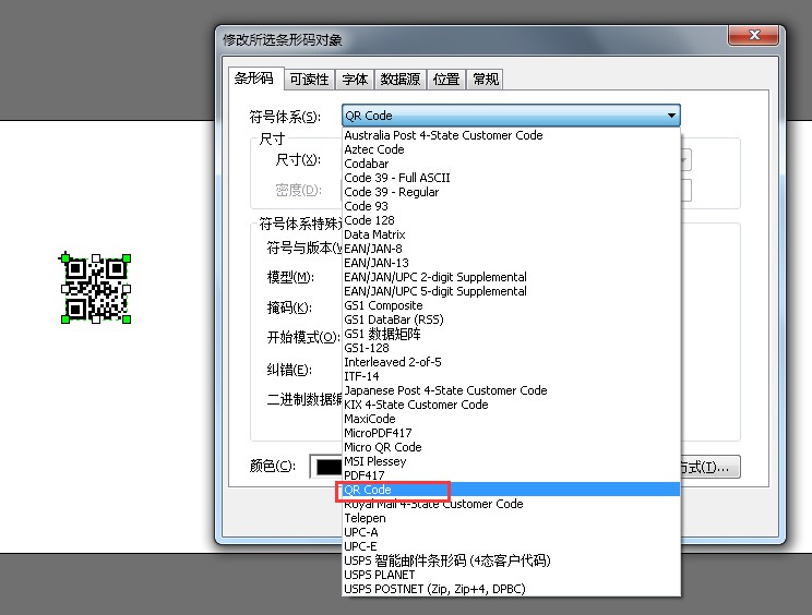 1.先拖拽一个条码标签到主界面, 然后右键其属性设置为二维码格式(测试)