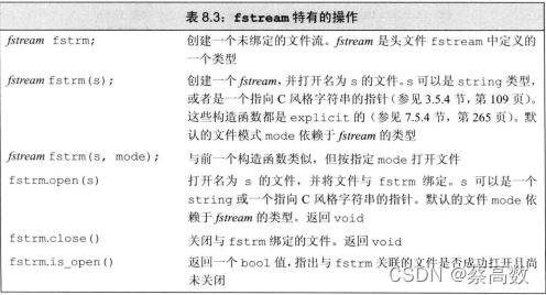 头文件fstream 定义了三个类型来支持文件IO: ifstream从一个给定文件读取数据,ofstream向一个给定文件写入数据,以及fstream可以读写给定文件。