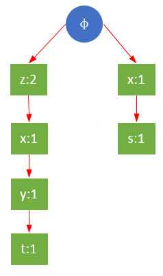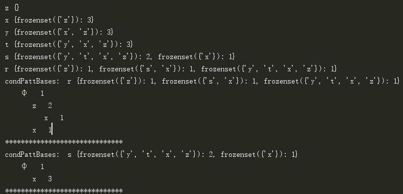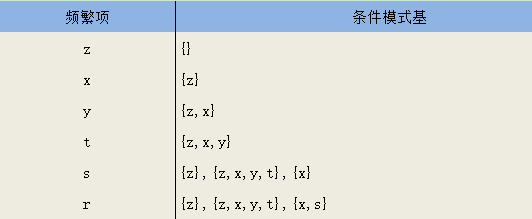 {s}的条件模式基,即前缀路径集合共有两个:{{z,x,y,t}, {x}};{r}的条件模式基共三个:{{z}, {z,x,y,t}, {x,s}}。