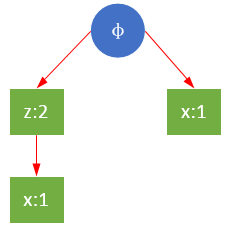 以频繁项r为例,构建关于r的条件FP树。r的三个前缀路径分别是{z},{z,x,y,t},{x,s},设最小支持度minSupport=2,则y,t,s被过滤掉,剩下{z},{z,x},{x}。y,s,t虽然是条件模式基的一部分,但是并不属于条件FP树,即对于r来说,它们不是频繁的。如下图所示,y→t→r和s→r的全局支持度都为1,所以y,t,s对于r的条件树来说是不频繁的。