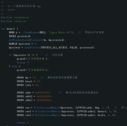 通过C/C++编程语言编写一个简单的外挂,通过 API 函数修改游戏数据,从而实现作弊功能 对象分析要用的 API 函数简单介绍编写测试效果 一.[对象分析] 本次游戏对象为 Super Mario XP 没有更新所以可用任意版本 试玩发现人物血量最大为 10,心最大为 99,命最大为 99 要用的 API 函数简单介绍 HWND FindWindow(LPCTSTR IpClassName,LPCTSTR IpWindowName); 通过类名或窗口名查找,返回窗口句柄 DWORD GetWi