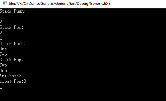 using System; using System.Collections.Generic; using System.Linq; using System.Text; using System.Threading.Tasks; namespace Generic { class Program { static void Main(string[] args) { Stack<int> s1 = new Stack<int>(2); s1.Push(1); s1.Push(2); s1.display(); Console.WriteLine("Stack Pop:"); Console.WriteLine(s1.Pop()); Console.WriteLine(s1.Pop()); Stack<string> s2 = new Stack<string>(2); s2.Push(@"One"); s2.Push(@"Two"); s2.display(); Console.WriteLine("Stack Pop:"); Console.WriteLine(s2.Pop()); Console.WriteLine(s2.Pop()); Console.ReadLine(); } } }