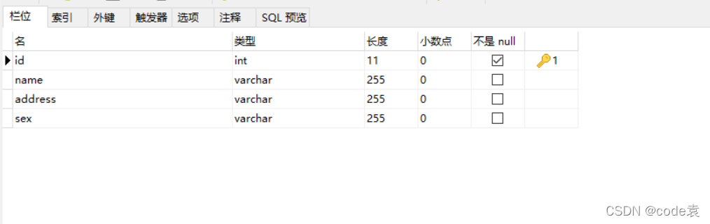 注意:在设计数据库时,id的类型为int并且设置为主键。自动递增。