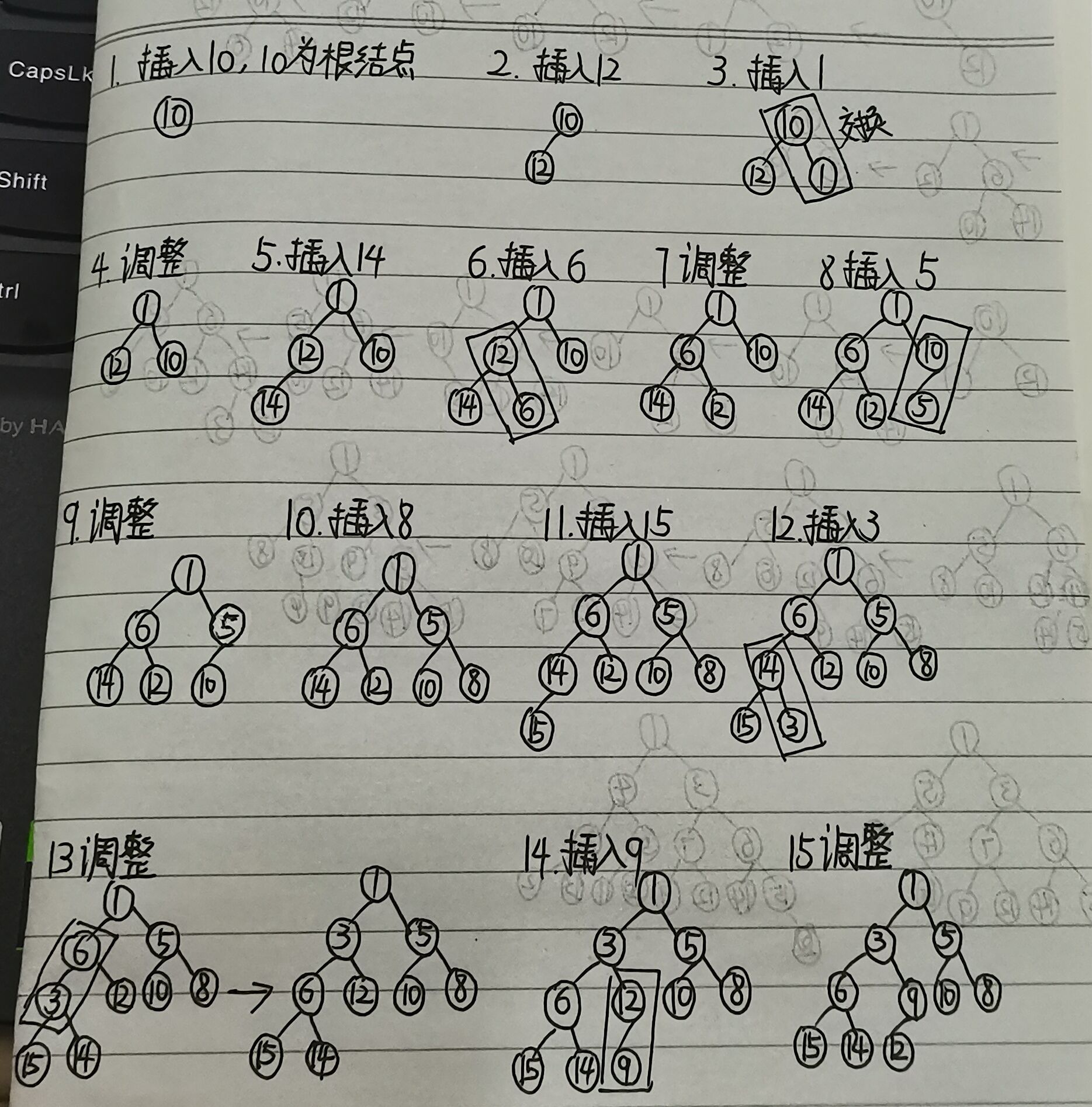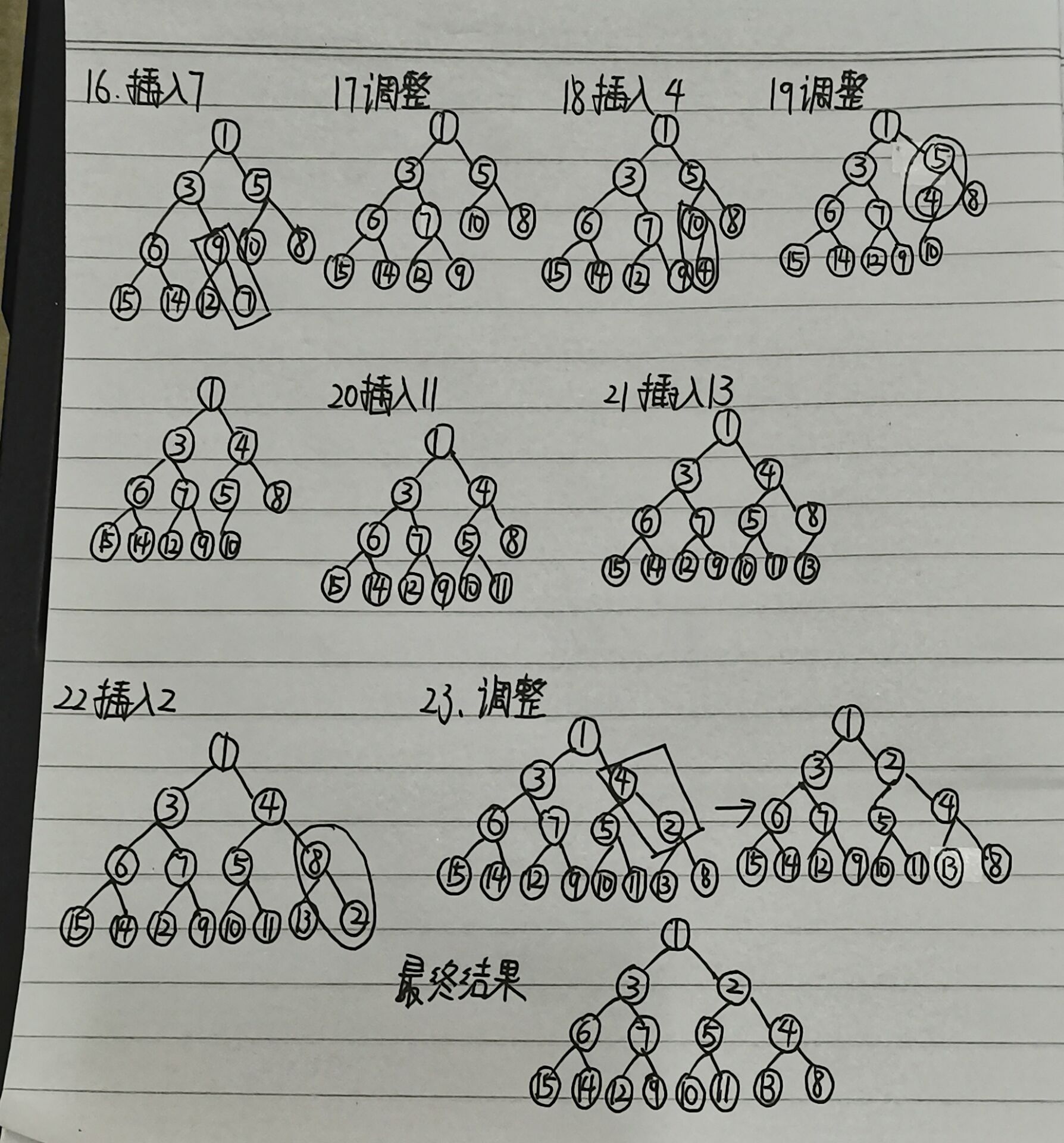 例:写出一次一个地将10,12,1,14,6,5,8,15,3,9,7,4,11,13和2插入一个初始为空的二叉堆的结果